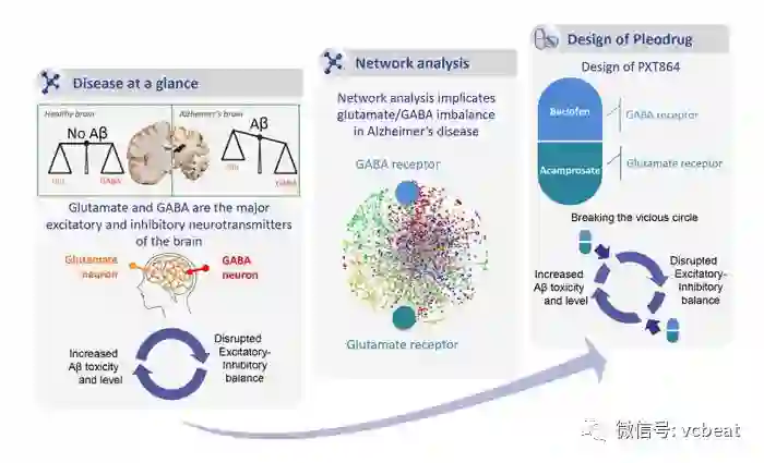 而它们出现在PXT864中,是因为Pharnext对两种药物进行网络分析后发现:两种药物同时存在,能够恢复兴奋性神经递质和抑制性性递质在脑内的平衡,从而能够缓解由于β淀粉样蛋白堆积而导致的失衡。