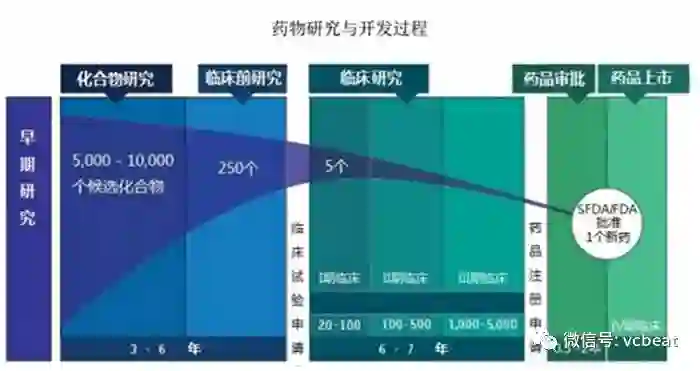 传统制药花费时间长,耗费的资金量很大。根据德勤2016年的报告Measuring the return from pharmaceutical innovation 2016显示,研发一款新药的平均时间是14年,平均花费在15.4亿美元。一款药物从研发到上市,要经过三个阶段,早期研究,临床研究和药品审批。
