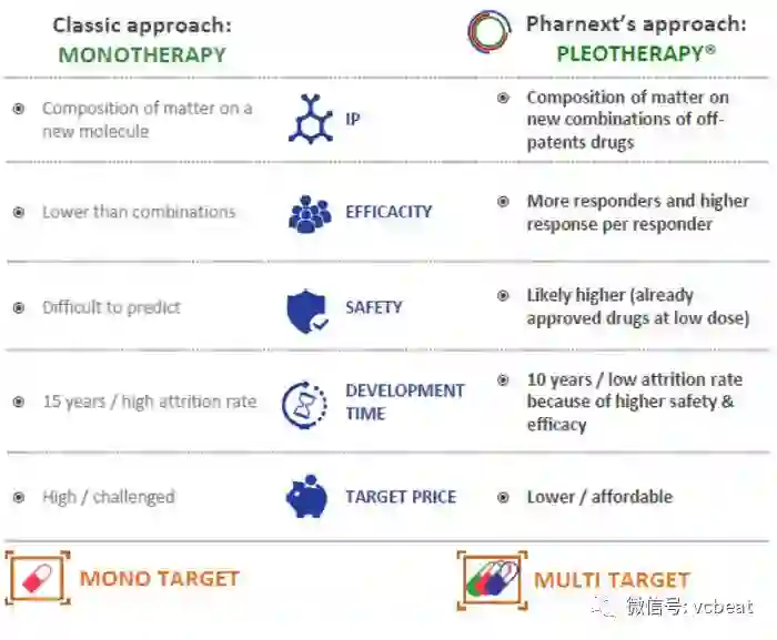 Pharnext的PLEOTHERAPY则代替了传统药物研发的的早期阶段。它并不从头开始研制化合物,而是通过充分发掘上市药品的药效,将这些药品以特殊的比例组合,利用它们的协同作用,得到全新的治疗药。