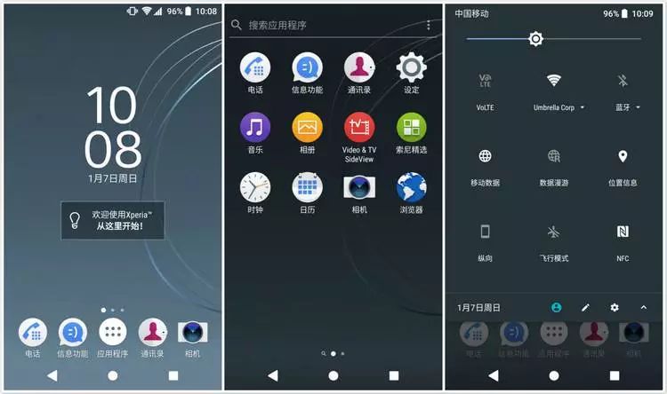 这套 UI 的基本操作逻辑和外观,与 Android 原生系统一致:有主界面与应用抽屉两级、下拉为通知与快捷功能按键、系统内置的索尼定制 app 也遵循 Material Design。