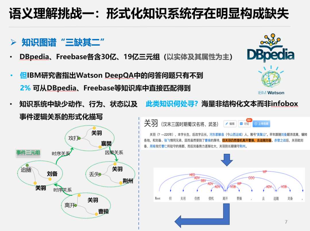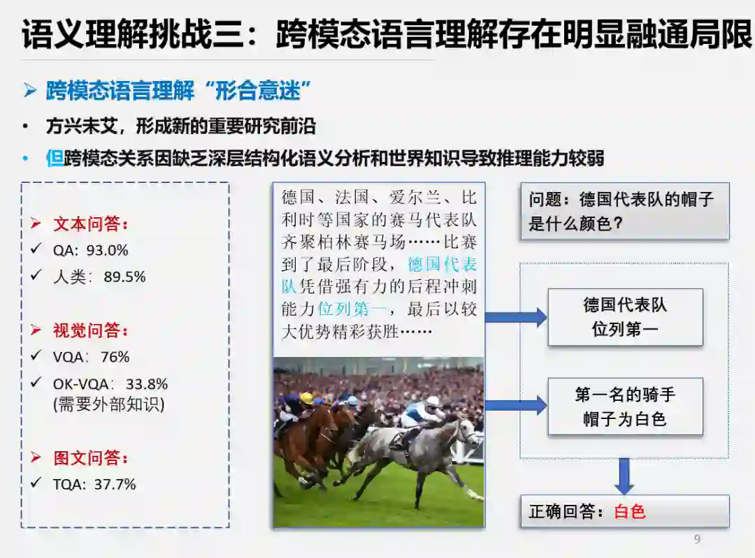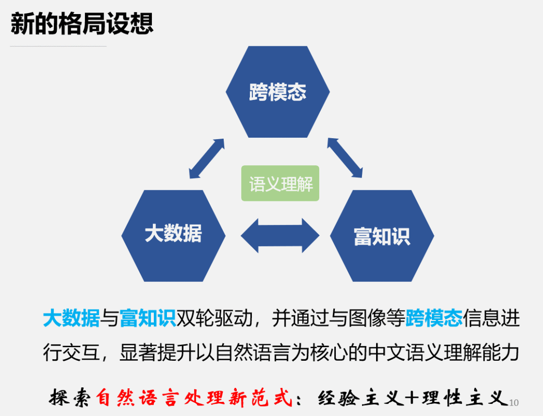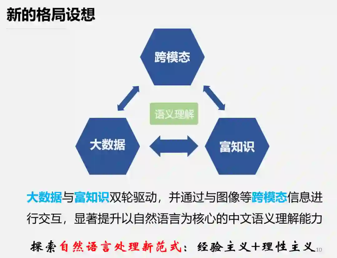 图注:何晓东 来自京东数科的何晓东博士认为有效利用多模态信息是走向通用人工智能的非常重要的方向。因为人的信息肯定是从多个模态来的,很多信息光读文本很难判断。举个简单例子,光看文本不能区别出颜色的意义,红色、绿色对文本来说是个符号。所以从这个角度来说,多模态肯定是 AI 走向通用智能的重要方向。但另一方面,利用多模态信息也非常困难。比如“看图说话”这件事情以前一直做不了,是因为图片本身的模型算法和语言算法完全不一样,到了深度学习提出概念做Embedding以后,才看到一些有意思的新希望。近年有研究将不同模态的数据表示投影到统一的连续空间,在这个空间中做转换运算,将原始的输入转换为抽象的表达,从这些抽象的表达中生成文本或图像。在这类研究中,如何学习一个通用的共有的语义空间,使得不同模态的信号能进行比较或者进行计算转换,以及在不同模态之间如何做映射,都是值得研究的问题,也是最近逐渐兴起的研究方向。这个方向有些意义和用途,比如最近很多做人工智能内容生成的算法模型开始实用化,京东用类似的模型,给定商品规格、商品图片,就可以生成一段关于描述这个商品的广告词,这是一个很简单的应用。反过来也一样,例如画一幅画,描述画一只鸟,是蓝色的背、红色肚皮,模型就可以创作出来,可以做更多创作性应用。另外何晓东博士指出,孙茂松教授提出的三个挑战对应的愿景是很好的技术路线,是否能定义一个评价标准,或者是一个具体的任务,来作为向这些愿景前进的量化评判方法。例如知识图谱从“三缺其二”到“三分归一”中,对于三元组的知识现有的评价任务是QA,而“三缺其二”中的“其二”可能需要更具现实意义的大规模任务来判定,这个任务是什么。其他两个愿景也是如此,应该利用什么任务进行评判。