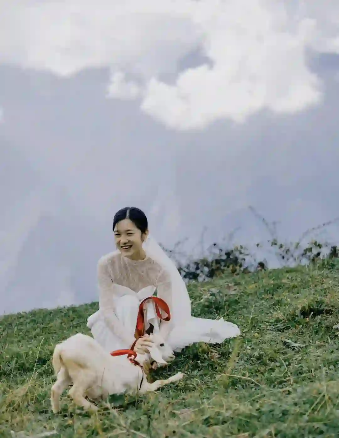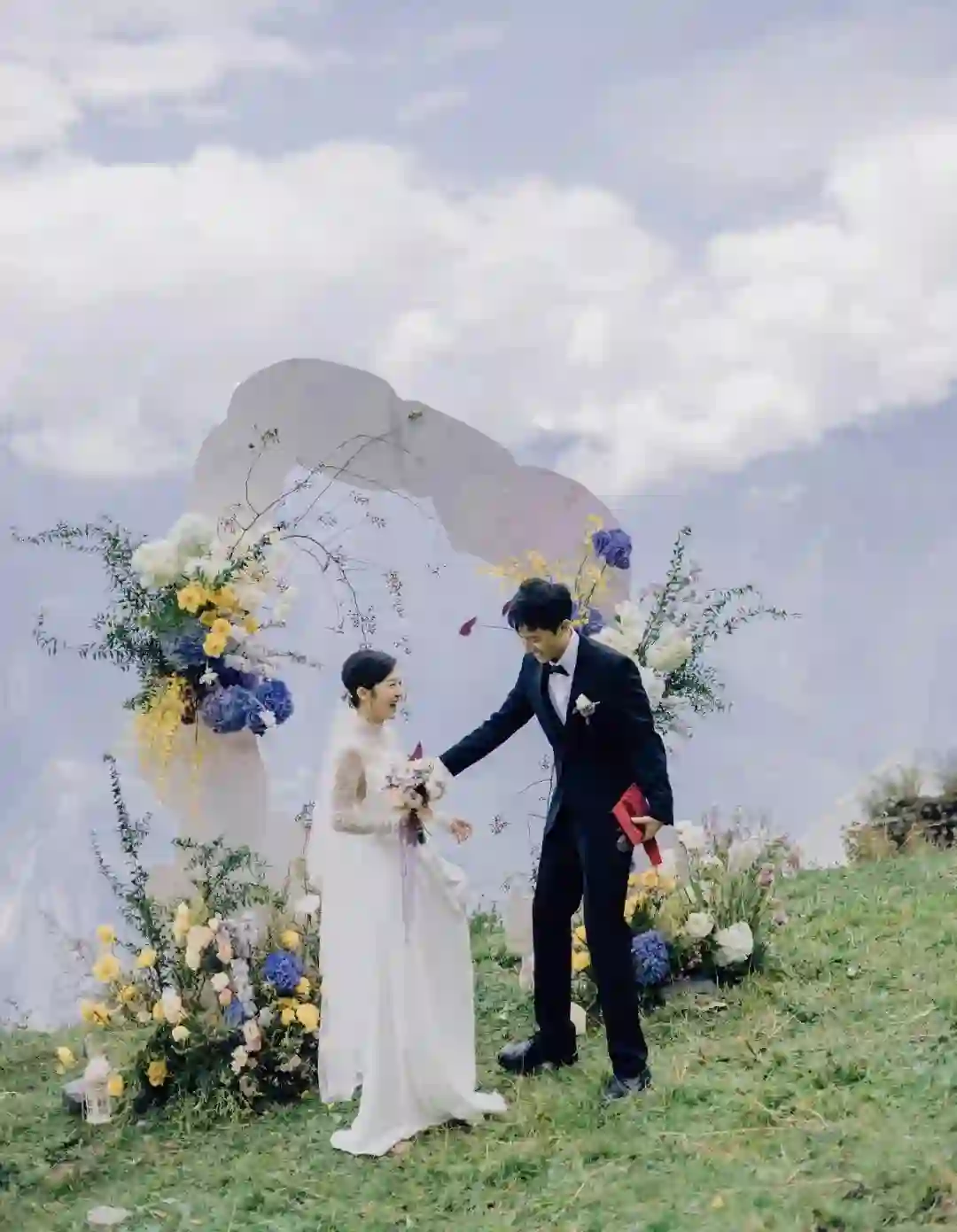 九月份,在四川阿坝州的浮云牧场里,小王和爱人站在山谷面前,背靠鲜花和白云,“一个靠近天空和自由的地方”。草坪上只有一群陌生人,几位婚庆公司的工作人员、四五位当地的藏民,和他们的山羊。