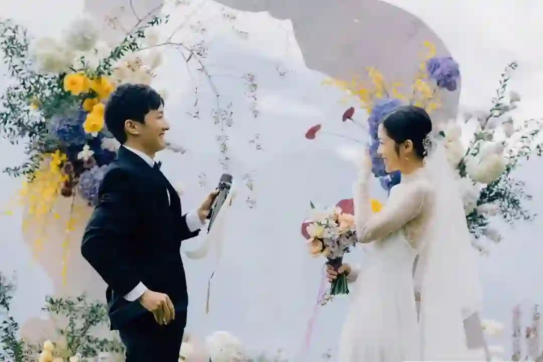 婚礼誓词甚至是头一天晚上才写好的,里面充满了许多只有他们两个人才能懂的笑话——这种誓词放在传统婚礼上显然是不合时宜的。因为不需要考虑台下坐什么人,不需要考虑说出来的话是否符合爸妈的心意,不需要考虑白色的花是否不吉利,妆容是否美丽,誓词环节痛哭流涕会不会丢脸……