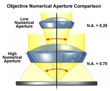 物镜有一个非常关键的参数——数值孔径。NA=nsinθ,n为介质的折射率,而θ则是进光张角的一半,也就是图上红色标注的角的一半。你直接看一张照片时它的分辨率显现不出来,但是你把它放大后就变得模糊,所以高倍镜对分辨率的要求更高,而显微镜的横向分辨率为0.61λ/NA,所以一般来说高倍镜的NA更大。
