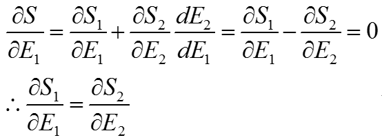 孤立系统的熵永不减小,平衡时熵最大。对这个系统来说,S在能量E给定的情况下有极大值。即E是一个常数,因此E2=E-E1。可见E1或E2只要有一个确定,那么另一个就确定了。