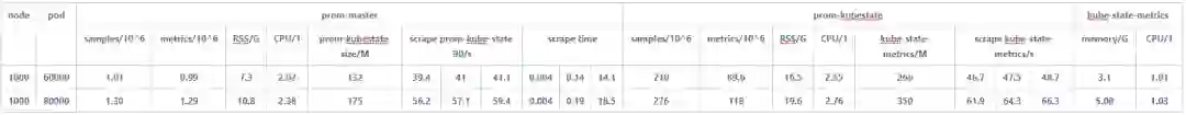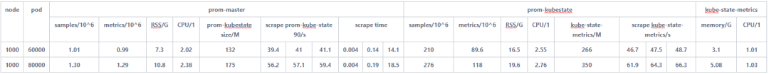 对于Prometheus master与Prometheus kube-state在1分钟抓取时间内最多可支持8w pod,主要瓶颈在于kube-state-metrics随着pod增加,数据量激增,一次抓取耗时不断增长。