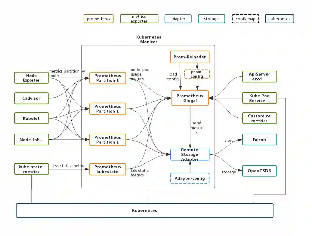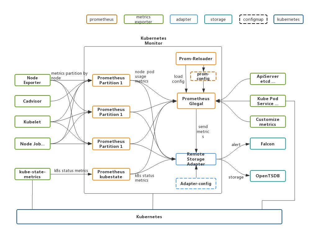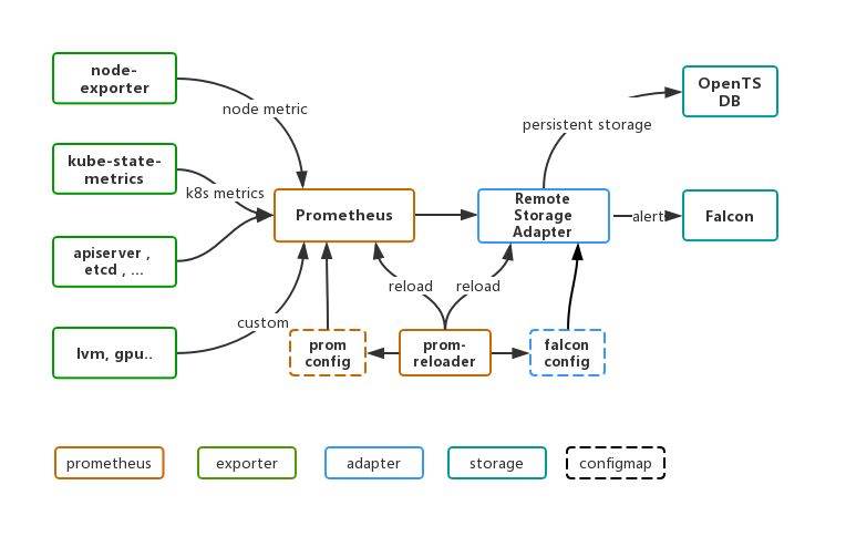 (2)Open-Falcon是公司内通用的监控报警系统,有完善的数据收集,展示和报警机制,但是Open-Falcon并不支持k8s这种拉的采集方案。此外,k8s里的各种资源,有天然的层次关系,这就决定了监控数据的整合需要强大而灵活的聚合能力,Falcon在这些方面不太能满足需求。但我们并不想重复造轮子,需要最大限度利用公司既有基础设施,从而节约开发和运维成本。