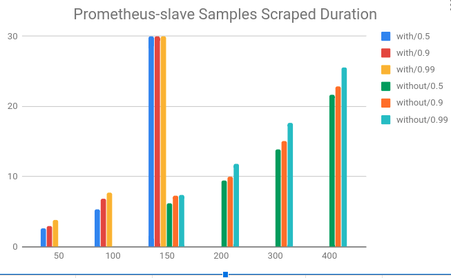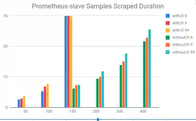 对于Prometheus slave由于采集部分数据,压力较小,单个Prometheus可抓取超过400个节点(60 pod/node)。如下图所示在开启remote write后抓取时间不断增加,后续将不断增加Remote-Storage-Adapter的性能。