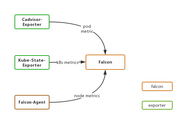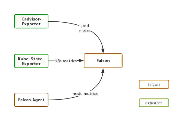 前期,为了尽快实现k8s的落地,监控系统借助Falcon还有内部开发的exporter,仅实现了对于核心监控数据的采集,如Pod的cpu,内存,网络等资源使用情况,具体架构如下图所示。