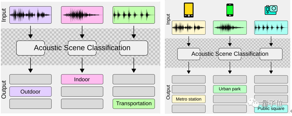 Task 1包含了两个子任务,子任务task 1a的声学场景识别系统要求识别不同终端设备,比如手机、ipad或其它录音设备采集的音频,识别成不同的类别。如下图(左)所示,将不同设备不同场景采集的信号正确分类成“地铁站”、“公园”和“公共广场”。采用不同设备来评估场景识别系统就是为了验证系统对多种设备的鲁棒性。子任务task 1b的声学场景识别系统限制性的将模型大小压缩在500k以内,在此条件下,需要场景识别系统尽可能高效的识别“室内”、“室外”、“交通”这三种常见的声学大场景。这里对声学模型大小提出要求的初衷就是为了更好地将现有科学研究方法迅速转换成可以真正意义的落地产品,以克服设备上运行深度学习网络高CPU消耗的难题。