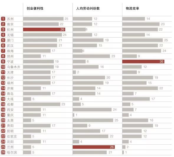 杭州在“创业便利性”变量排名第一,得益于杭州近年来大力支持创新创业。作为阿里集团的发源地与总部所在地,杭州已成为中国最重要的电子商务中心、国家高新技术产业基地和创新中心。