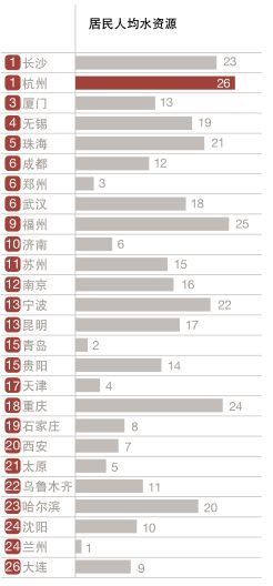 数据梳理结果,长沙与杭州并列第一。长沙在维度中居首得益于在“碳排放”变量上排第一,在“污水集中处理率和生活垃圾无害化处理率”变量上排第二,在“居民人均水资源”位列第四,使得累计积分最高。变量统计是枯燥的,并且有些抽象,但这一结果与现实生活却十分贴切。