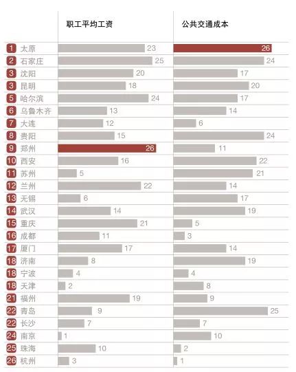26座城市中,投资及生活成本最高的城市是杭州,特别是在公共交通和住宅价格变量上排位明显。珠海在维度排名中跟在杭州后面,成为26座城市中成本第二高的城市,缘于在“食品价格”和“生活服务价格”两个变量上位置突出。
