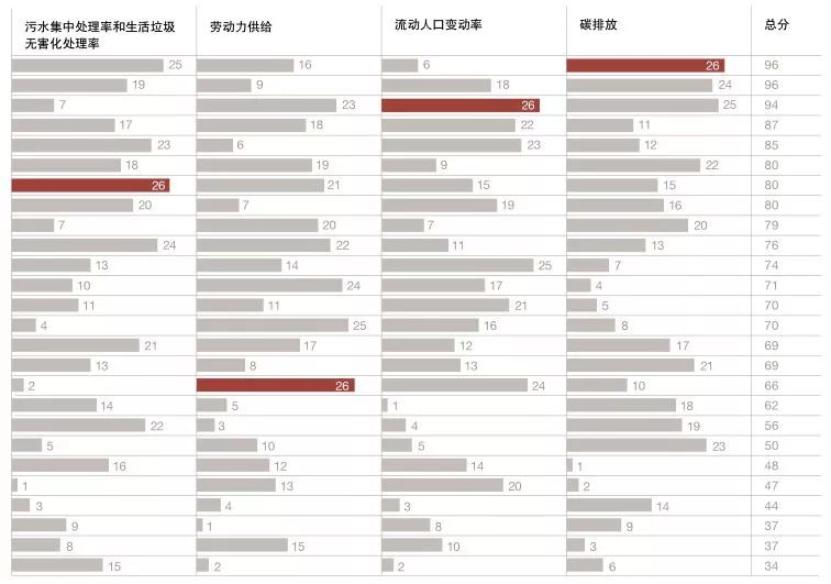 其中,“城市流动人口状况”观察的是城市5年间流动人口的变动。在这个维度中,珠海和南京在多数变量中排位靠前,因此总排名连续两年位列前茅。排名紧随其后的是杭州、厦门、武汉和西安。