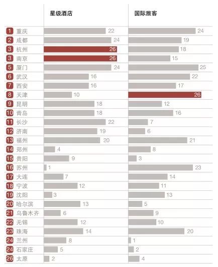 观察的对象既包含省会城市,也考虑了区域内经济发达的城市,同时也选择了与国际交往关系深厚的门户城市。统计表明,重庆、成都、杭州和南京(并列)、厦门排名位列前五。
