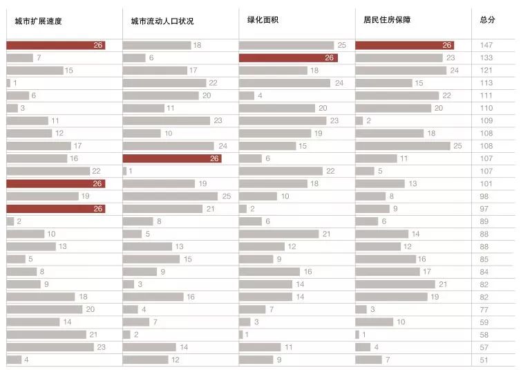 在26座城市的总排序中居后位的乌鲁木齐,在“住宅价格”变量上位居第一,不仅显示了实际生活成本的某一方面,而且使该城市的总积分有所提高。乌鲁木齐在总排序中超越了石家庄、哈尔滨、兰州,在这个变量上积分高是因素之一(乌鲁木齐在维度八的“城市服务业比重”变量上也有突出表现)。