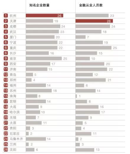 作为直辖市的天津,在26座城市的排名中仅列第七位,天津在这个维度能够凸现出来,一定程度上是因为“金融从业人员”采用的是按绝对数取值。