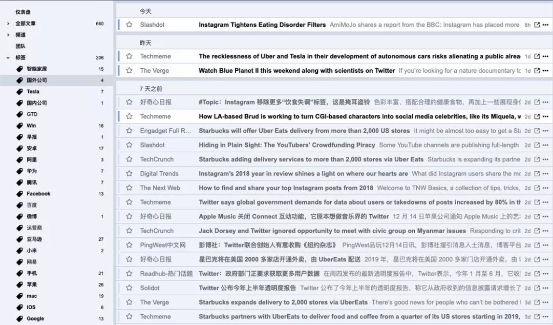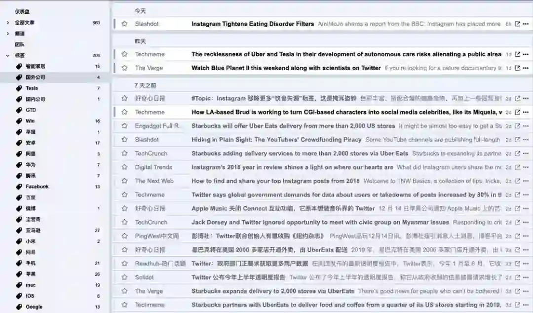 Inoreader 我觉得它的优势就是访问的稳定性和支持高度自定义的筛选规则。我曾经尝试过 TIny Tiny RSS 这种自己架设的 RSS 服务,但访问的速度和稳定性都差强人意,最终还是换回了 Inoreader。高度自定义的筛选规则对我来说非常重要,毕竟我每天抓取的信息一般都在 2000 条以上,如果没有自定义规则,我很难快速地获取最重要的信息。我会把自己关注的公司和领域制作成筛选器,每天用 5 分钟时间就能了解当天的大新闻,非常方便。
