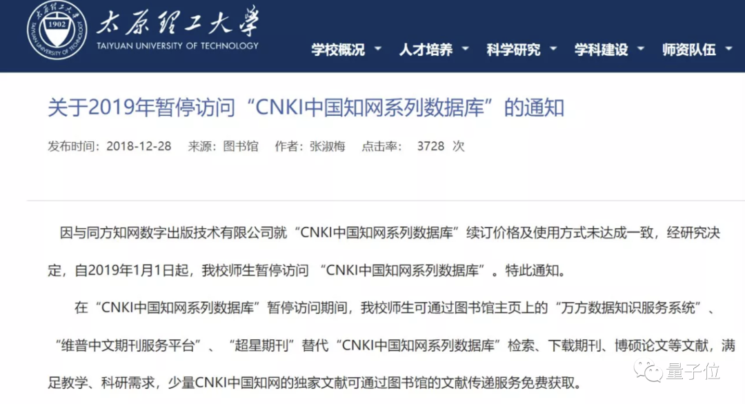 2018年12月,太原理工大学在其官网也挂出“停用知网”的公告: