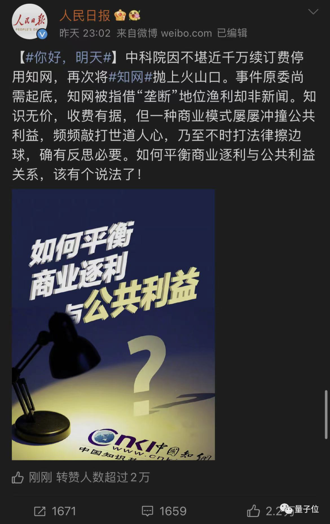 而回归到知网引发舆论此事本身,人民日报在其官方微博对此作出了点评: