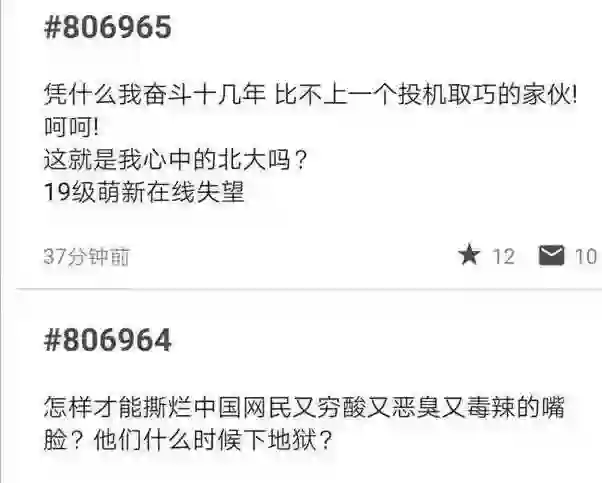 “又穷酸又恶臭的中国网民舆论绑架北大”; “当助教把他们挂走”; “十几年的奋斗比不过一个投机取巧的家伙”; “没必要和大部分211都上不了的网民一般见识”; “如果让这些叫嚣的网民到北大当狗,估计他们都愿意”......