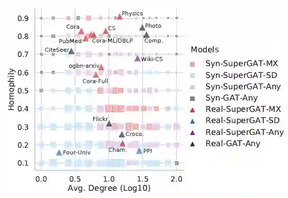 本文核心:提出SuperGAT模型,通过对图网络中存在的边对节点表示学习进行调整,主要是将图网络中的边是否存在这个点以损失形式加入到loss函数中,并探讨了影响图注意力机制的两个重要因素: homophily和average degre.