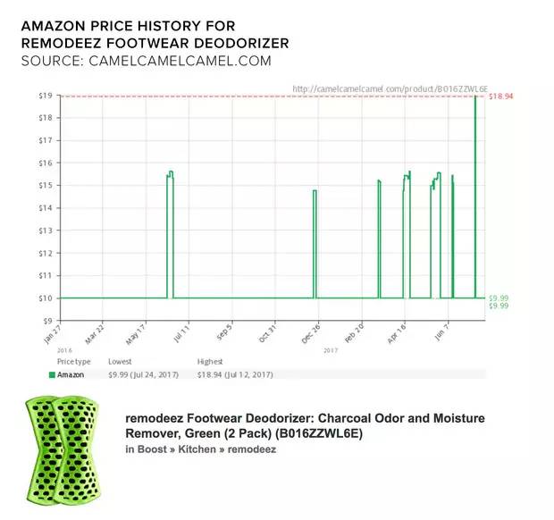 亚马逊的动态算法是美国鞋类除臭剂制造商Remodeez的创始人Jason Jacobs发现的,通过仔细的观察,他发现自家产品在亚马逊上的价格波动了,一旦某个媒体在新闻报道中提到了他们的除臭剂,亚马逊的零售价格就会上涨。最近一次价格波动是在Buzzfeed推荐该除臭剂后,亚马逊的价格从原来的9.99美元飙到了18美元。