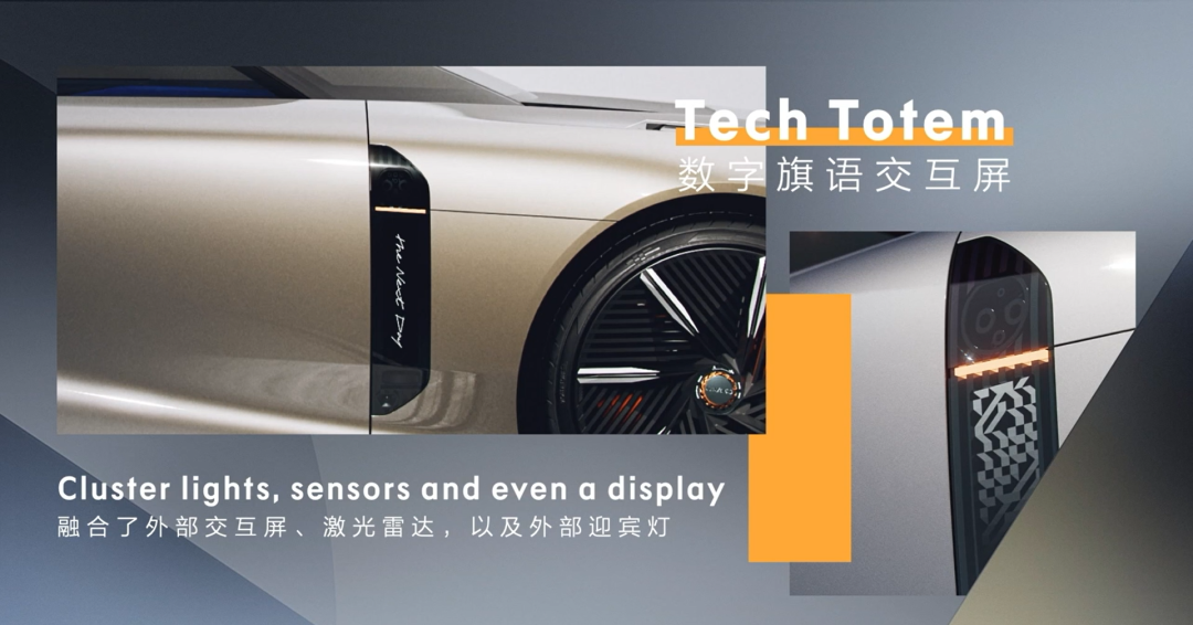 车身侧面和引擎盖上,装有可显示信息的三块交互屏,用来显示车主交互、充电信息,有些个性鲜明的用户也能把签名投射上去。