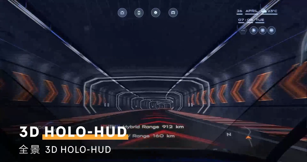 接下来,前排乘客就能好好享受大尺寸 HOLO-HUD 显示的各种信息了。正如我们在《碟中谍》里看到的那样,挡风玻璃此时就是一个巨大的投影荧幕,看行车信息、接入电话会议或者干脆看场电影,理论上不是问题。