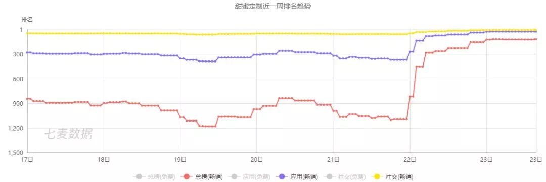 在今年,「甜蜜定制」从 5 月进入中国市场后,在 5 月 22 日成绩格外突出,目前从畅销榜来看 App Store 总榜(畅销)中已到达 121 名,应用(畅销)排名第 26 ,而在社交(畅销)排行中,达到第 7 的好成绩。就仅 22 日一天,下载量高达 19 万,究其数据,其潜在市场是非常大的。