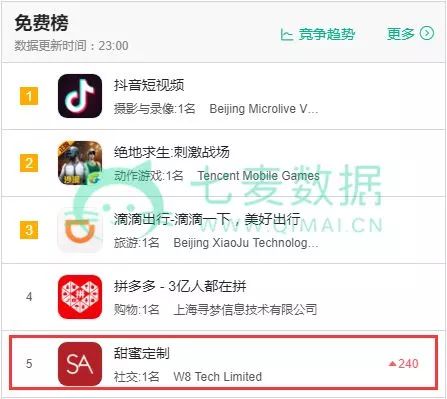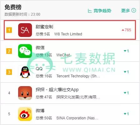 5 月 22 日,一款名叫「甜蜜定制」( Seeking Arrangement ,简称为 SA )的 App 挤掉了社交 4 大红人——「微信」、「QQ」、「探探」、「微博」,直升 765 名,登顶 App Store 社交类应用排行榜,并且挤进总榜 Top 5 。