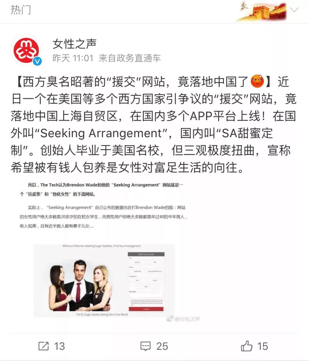 2009年,《纽约时报》对“ Seeking Arrangement ”进行过报道,并且认为这是一个打着社交网站招牌的“援交”网站,“年老的有钱男人和可爱的年轻女性进行残酷坦诚的交易。他们不寻找长期的灵魂伴侣;他们希望通过货币进行交易的无条件安排:财富,青年和美丽。”