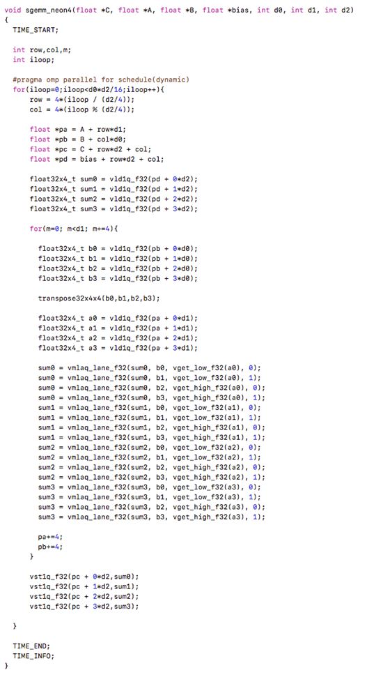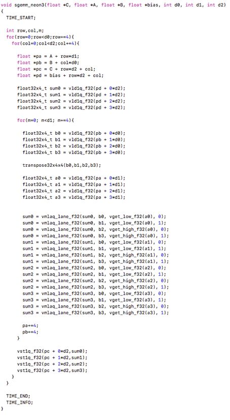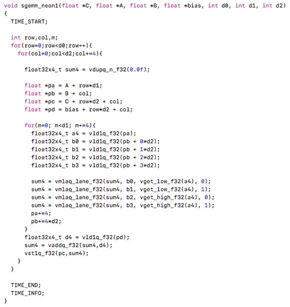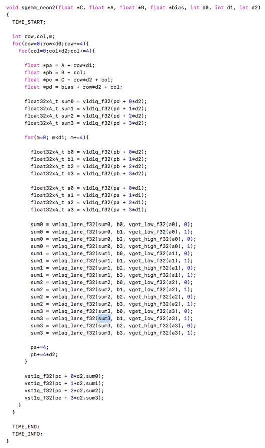 如果对某个模块的性能要求很高,编译器的输出不满足要求,这时候,就需要使用内联汇编;对于xNN中的核心模块卷积运算,都是通过内联汇编实现,性能比NEON Intrinsic提升10%左右。以下是ARM官方例子: