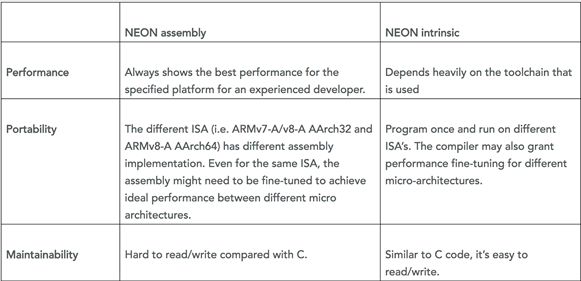 大部分情况下采用NEON Intrinsic编程就够用了,NEON Intrinsic的好处也是非常明显的,首先,在armv7,armv8平台都可以跑,其次,代码简洁容易理解和维护,另外,编译器还会根据不同平台做代码重排;但是NEON intrinsic也有一些缺点,比如没有预取指令,分解Neon寄存器很麻烦,寄存器分配可能不高效,无法做显式的对齐加载,编译器可能会引进一些奇怪的指令,造成性能低下。