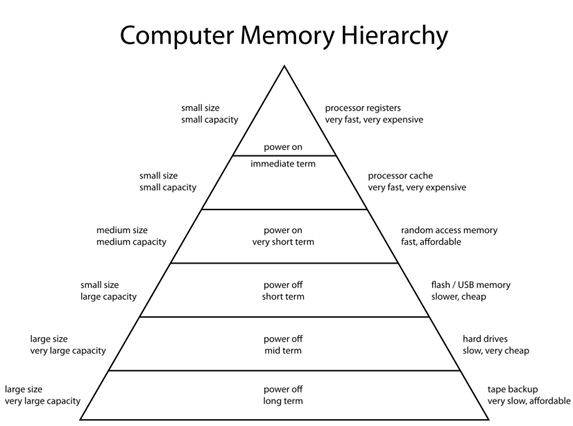 基于CPU内存子系统的优化工作很大部分都是在想如何高效地利用缓存(cache),尤其是图像视频处理这种大量数据交换的场景。几十年前,我们的老前辈就发明了主存,多级缓存, 寄存器用来弥补存储器与计算单元的性能差异,直到今天这个问题还没有解决(或许一直都不会解决,存储器和计算单元的设计思路是不一样的,高速ram的成本肯定是高的)。存储层次如下图,原理很简单,你想跑得快,只能背得少,你想跑得快,还想装的多,那就要多掏钱买个车。