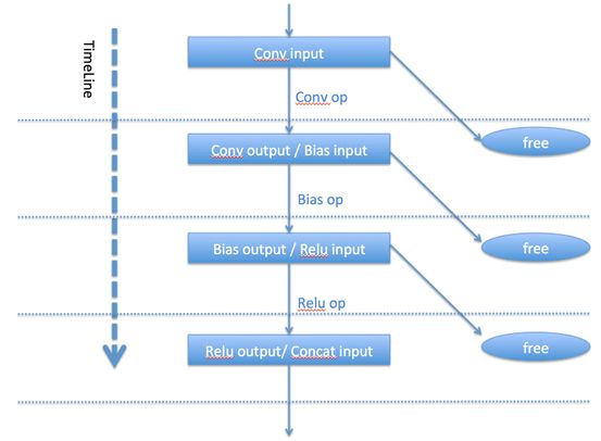 实际上,推断过程中,大部分输入层在做完运算后,可以被马上释放,所以完全存在复用内存的可能性。