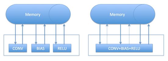 如果反复的读写一段内存进行运算,效率上肯定不如“一次读取-多次运算-一次写入”来的更高效。比如,DL模型中,一般CONV层后面跟着RELU,BIAS层,本着内存访问能省则省的原则,通过提前分析网络的结构,可以将CONV层和bias合并,甚至将CONV+BIAS+RELU合并在一起进行运算,可以获得很好的gain. 比如: