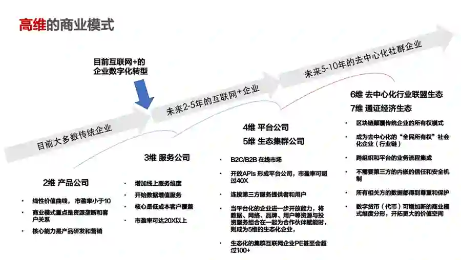 为什么说是高维商业模式呢?目前大多数传统企业,都是二维产品公司,其商业模式的重点是资源垄断和客户关系,核心能力是产品研发和营销。而目前互联网+之下企业所进行的数字化转型,其实就是上升到三维,增加了线上营销和客户服务维度。这些商业模式在10年前就已经出现过了,技术迭代和社会环境的发展变化中,如今很少有人再提互联网+了。四维的模式就是平台公司,主要是B2C/B2B的双边和多边在线市场。当平台化的企业进一步开放能力充分生态化,将数据、网络、品牌、用户等资源与投资服务组合在一起为合作伙伴赋能时,它就又增加了维度,成为了生态集群公司。因此它的投资回报率会更高。Web3.0时代的高维商业模式,将有机会用“去中心化”的方式颠覆所有的传统企业,这样就形成了去中心化行业联盟生态。未来还会发展出通证经济生态(Token Economy),未来人类社会的全部权益证明,都可以用通证来代表。数字货币可以增加新的商业模式维度分形,开拓更大的价值空间。