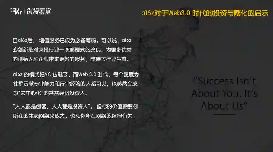 自a16z之后,所有的VC都看到了,增值服务已经成为必备筹码,不再是简单的投项目,而是真正的为产业生态和创业者赋能。可以说,a16z在这方面的创新是对风投行业的一次颠覆式改良。a16z的模式把VC去魅了,而在web3.0时代,每一个愿意为社群贡献专业能力和行业经验的人,都可以也必然会成为“去中心化”的共益经济投资人。人人都是创客,人人都是投资人。