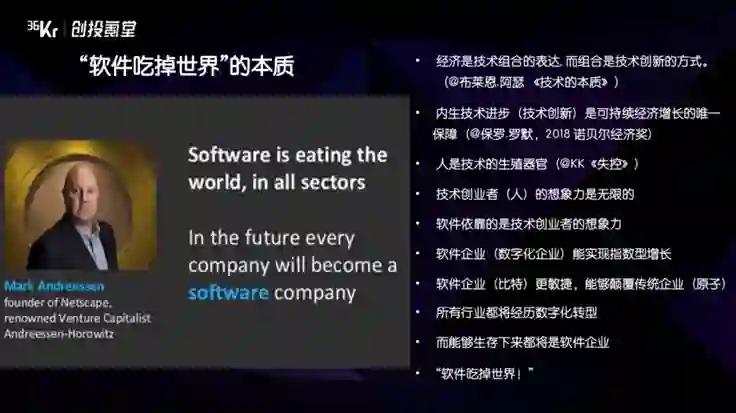 早在2011年,当a16z基金规模只有3亿美金还在起步阶段时,创始人马克·安德森(MarcAndreessen)就提出一个观点,说未来所有的企业都会变成软件公司,软件将吞噬掉世界。很多人觉得这是技术派出身创始人的狂言。但当时他说,所有未来的企业都是软件公司,所以我们要投就要投软件。其实这句话是有其很深的内在逻辑。