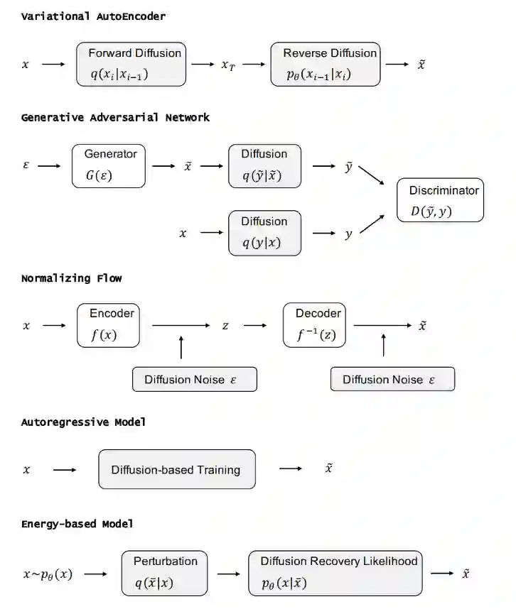 在下面的每个小节中,我们首先介绍其他五类重要的生成模型,并分析它们的优势和局限性。然后我们介绍了扩散模型是如何与它们联系起来的,并说明通过结合扩散模型来改进这些生成模型。VAE,GAN,Autoregressive model, Normalizing flow, Energy-based model 和扩散模型的联系如下图所示: