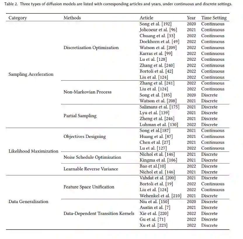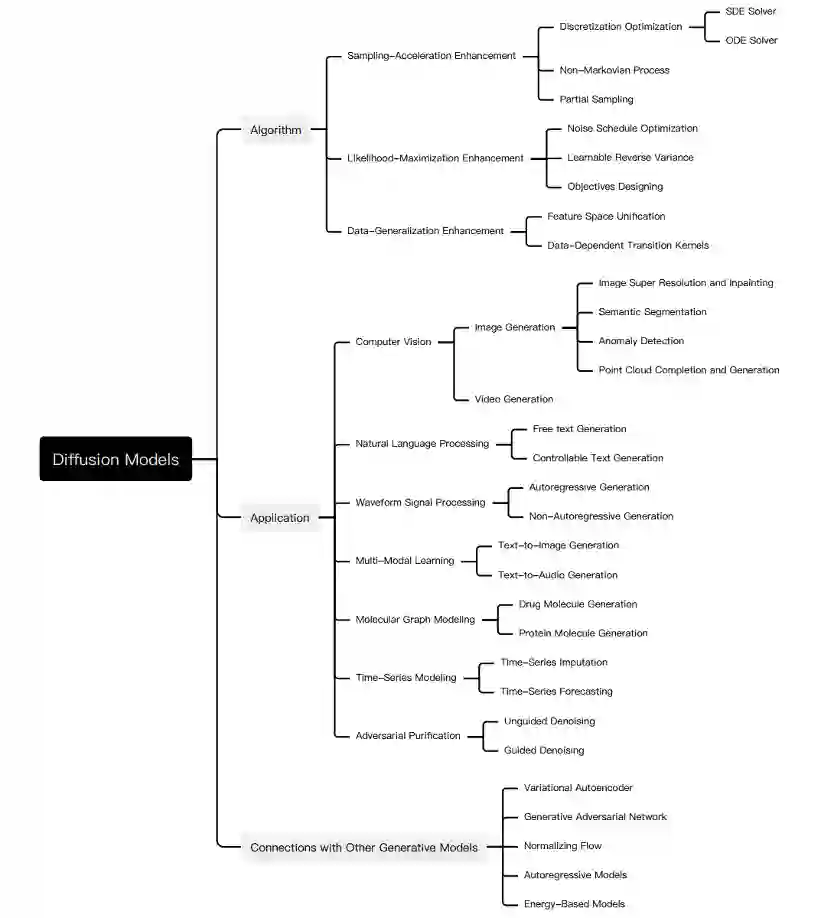 1. 新的分类方法:我们对扩散模型和其应用提出了一种新的、系统的分类法。具体的我们将模型分为三类:采样速度增强、最大似然估计增强、数据泛化增强。进一步地,我们将扩散模型的应用分为七类:计算机视觉,NLP、波形信号处理、多模态建模、分子图建模、时间序列建模、对抗性净化。