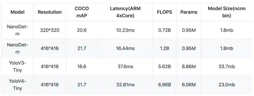 ,兼顾检测和定位的精度,在 COCO val 5000 张图片上测试,并且没有使用 Testing-Time-Augmentation。在这种设置下,320 分辨率输入能够达到 20.6 的 mAP,比 tiny-yolov3 高 4 分,只比 yolov4-tiny 低 1 个百分点。在将输入分辨率与 YOLO 保持一致,都使用 416 输入的情况下,NanoDet 与 yolov4-tiny 得分持平。具体结果如下表所示: