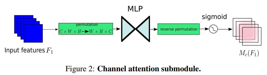通道注意子模块使用三维排列来在三个维度上保留信息。然后,它用一个两层的MLP(多层感知器)放大跨维通道-空间依赖性。(MLP是一种编码-解码器结构,与BAM相同,其压缩比为r);通道注意子模块如图2所示: