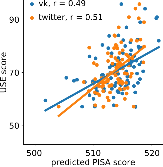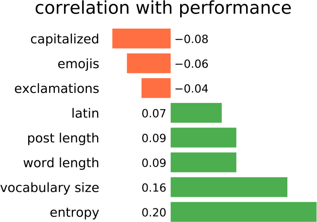 在他的研究中,社交媒体帖子中的每个单词都具有不同的“排名”或者“分数”。比如,科学和文化主题、英文单词以及篇幅较长的单词和帖子可作为良好学术表现的评判指标;而丰富的表情符号、使用大写字母书写的单词或短语,以及与星座、驾驶等相关的词汇则代着学生有较差的在校成绩。 图 | 一般文本特征与学习成绩的皮尔逊积矩相关系数(Pearson correlation coefficient)。(统计学中,这一系数用于度量两个变量之间的相关程度,其值介于 -1 与 1 之间,在自然科学领域中则广泛用于度量两个变量之间的线性相关程度。) 相关研究论文以“Estimating educational outcomes from students’ short texts on social media”为题,于今年 9 月在线发表在EPJ Data Science上。