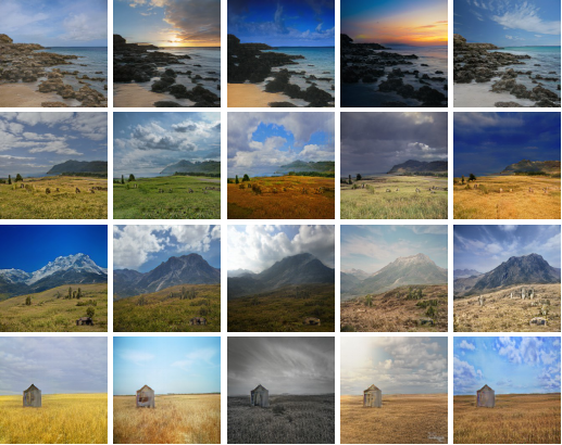 最后,受到之前工作的启发,我们从 Flicker 上获取了5万张风景图片作为训练数据,让用户能够通过手工描画语义分割一键生成风景大片。与之前的工作相比,我们生成的质量更高,且允许用户通过选择范例图来指定风景照风格。下图是我们得算法生成的风景大片。