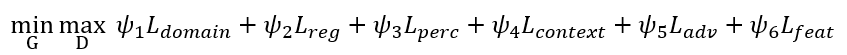 为了学到正确的对应关系,我们对输出图像施加以下约束。1)特征匹配损失(perceptual loss):输出图像必须符合输入图片的语义约束,因此,我们要求它们经过预训练 VGG19 后的高层特征——Relu4-2层——应保持一致;2)上下文损失(contextual loss)[5]:输出图像应和范例图的对应物体风格相一致,为此我们在 VGG19 的低层特征图(Relu2-1, …. Relu5-2,更多的包含颜色,纹理信息)上匹配二者的统计分布。3) 对抗损失函数(adversarial loss):我们联合训练判别器 D,使得最终的输出图片难以与真实图片区分开来;4)特征匹配(feature matching):我们将 x_B 做形变增强,构造为 x_A 的伪范例,这样的伪范例对(pseudo exemplar pair)的输出应能完美重建 x_B,这里我们采用 VGG 特征匹配损失函数。