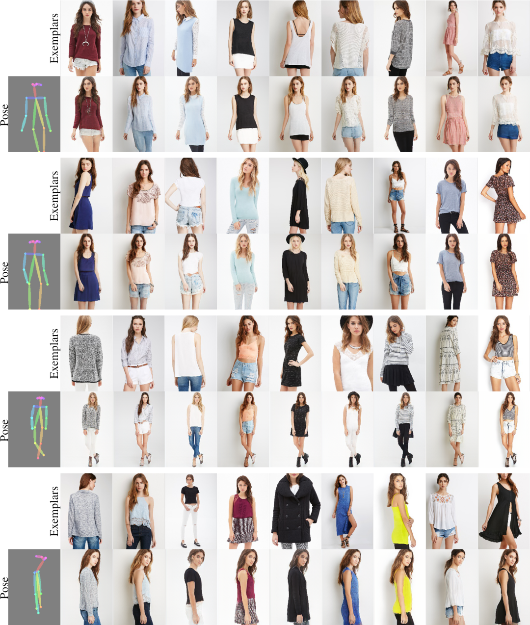 图7:Deepfashion 数据集上姿态关键点->人体姿态图片的图像翻译结果