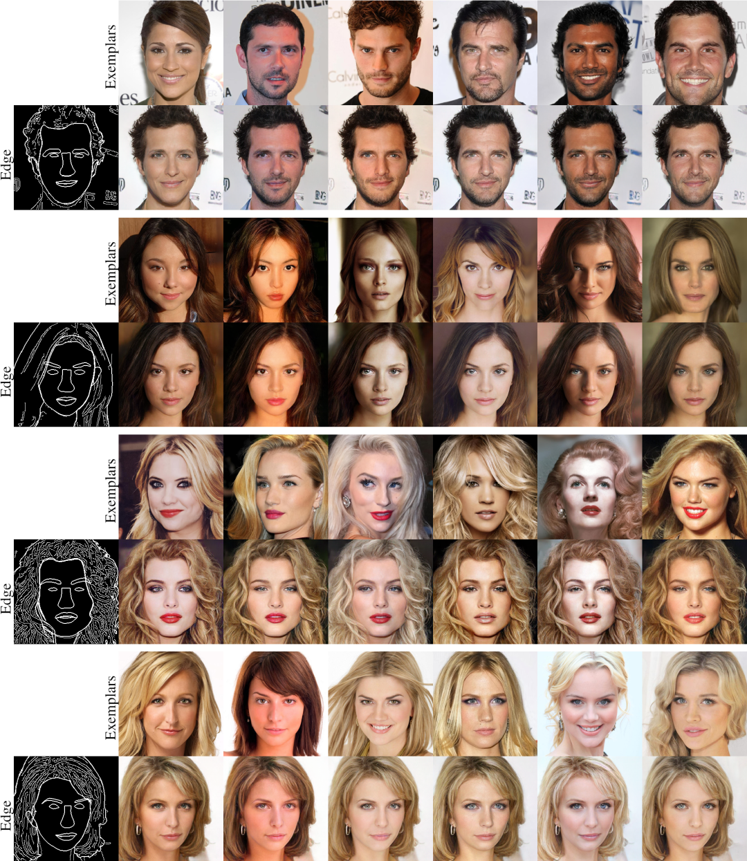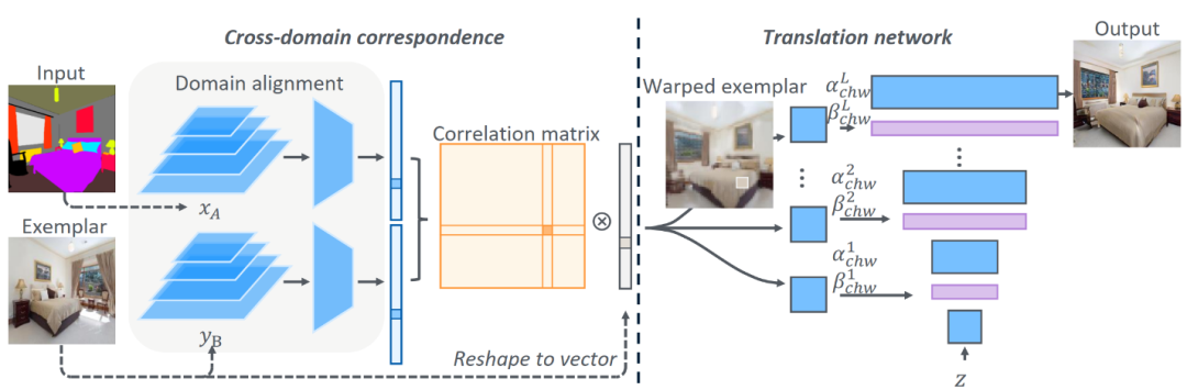 因此,我们提出建立两个域图片(输入图及范例图)之间的密集语义对应(dense correspondence),进而依赖这样的对应,定位输入图在范例中相应位置的颜色、纹理信息,使得生成图片风格精细匹配范例中相同语义的物体(例如,草图的生成结果中,眼睛应该采用范例中的人眼细节)。同时,这样的方法也有助于降低网络学习难度、提高输出图片质量——这是因为网络可以更多地参考范例图中的细节,而无需预测物体的纹理细节。