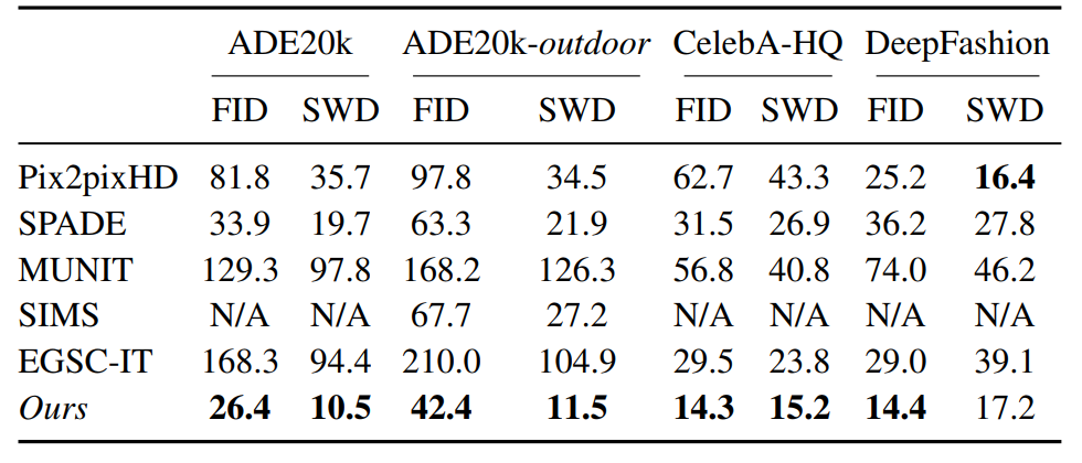 表1:图片质量的定量比较。我们采用 FID 和 SWD 两种指标,在不同任务中均取得明显优势